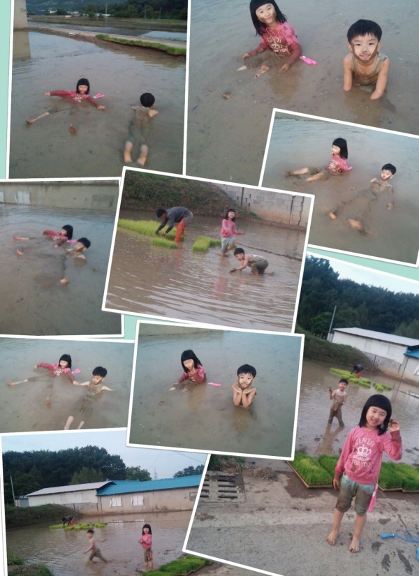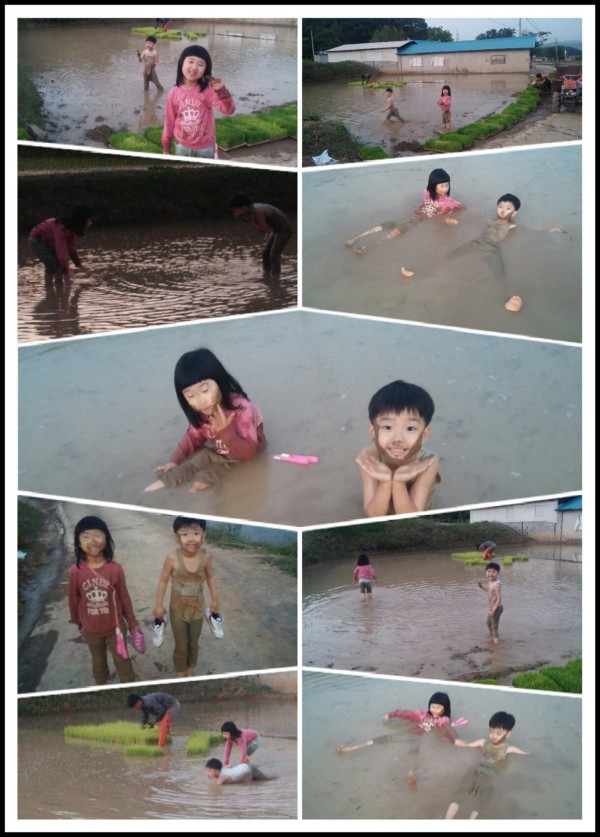 할아버지가 뇌출혈로 쓰러져 매주 경주 시댁에 가서 농사일을 도우시는 아빠가 함께 놀아주지 않아 속상해 하던 아들,딸은 논에서 함께 뒹굴면서 노는 것으로 나름 행복한 추억을 만들었네요^^ 시어머님은 모심기 논바닥 다 망쳐 놓는다고 웃으면서 혼줄을 내셨지만, 어린모를 심기위해 경운기로 로타리를 치고 정성껏 논바닥을 정리해 놓은 논은 어린 아이들이 밟아도 보드랍고 고와서 온몸으로 즐기는 연연생 아들딸은 마냥 즐거워보였습니다. 마치 머드축제 장과 같았습니다. 주말에 아이들 데리고 여행도 못가는데 미안한 마음도 있었고 피할 수 없으면 즐기라고,,,어린아이들의 농촌나들이는 그때만 느낄수 있는 아름다운 추억이 될수도 있겠다고 생각하여 마음껏 즐기라고 하였습니다, 마냥 즐거워하는 아이들의 추억이라도 남기자고 찍은 사집입니다.,,,묵묵히 일만하는 아빠도 대박이었네요,ㅎㅎ 80평생을 살아오신 시어머님이 보시기엔 기도안차는 진풍경이였겠지만요,,,ㅎㅎ