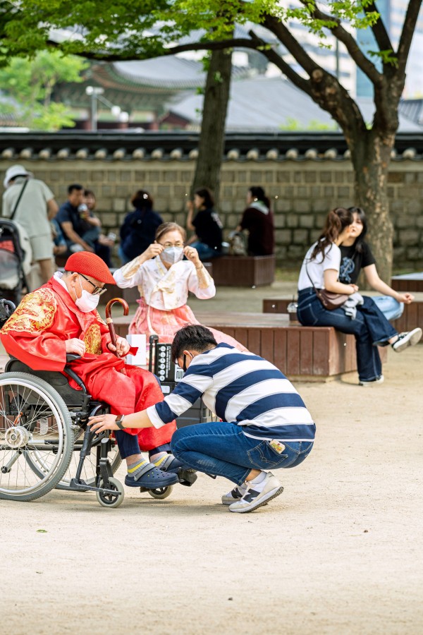 1. 어머니와 함께 거동이 불편하신 어버지를 휠체어로 모셔 임금님 복식으로 고궁나들이를 시켜드리고 있는 아들의 효심을 표현함.