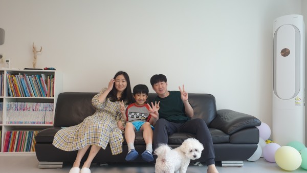 해맑은 아들과 요염한 자태로 끼어든 강아지 밀크의 조화가 재미있는 사진입니다.