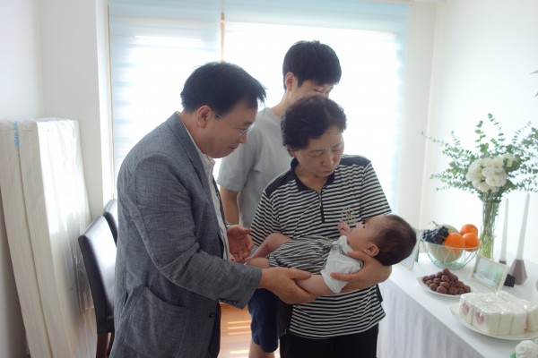 100일을 맞이한 손자를 조심스럽게 안아보시는 할머니와