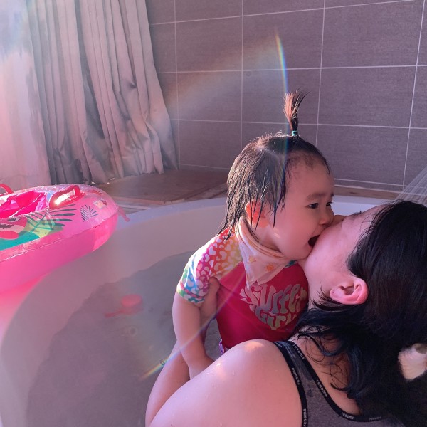 [사연2]아이랑 사천 여행 간 날 처음으로 물놀이 하던 날. 뽀뽀하는 아이 머리위에 무지개가 떴네요