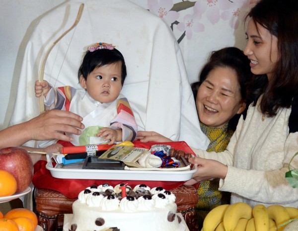궁금해-할머니가 다문화 가족인 손녀가 돌사진 촬영하면서 넘어지지 않게 붙잡고 있다가 돌잡이 때 무엇을 잡았는지 궁금하여 내다보며 웃고 있다.