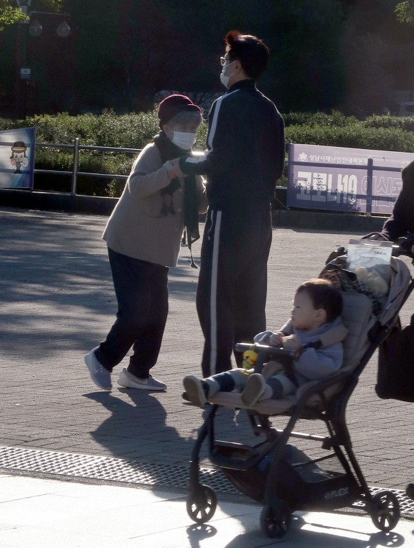 걸음마 배우는 어머니- 아들이 걷기가 어려운 어머니를 휠체어에 모시고 공원에 나와 두 손을 잡고 걸음마를 하고 있다.