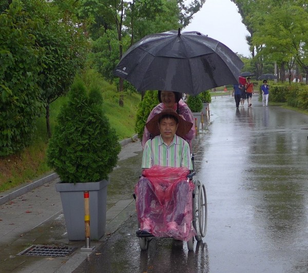 아내는 휠체어를 밀고 또 비옷을 챙겨입히고 일일이 케어하느라 무척 고생을 했었다.