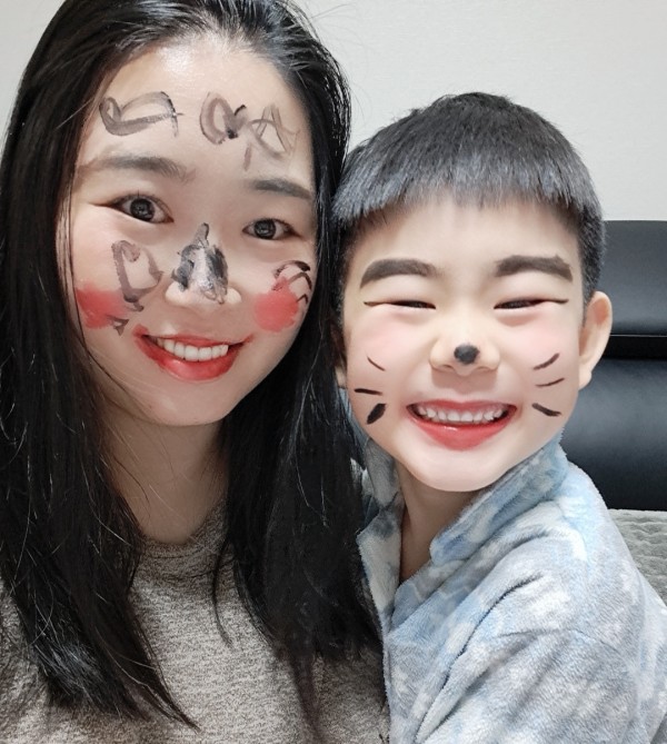 "자, 엄마의 얼굴은 이제 너의 도화지야. 엄마 얼굴 도화지에 너가 그리고싶은 걸 그려봐~ "