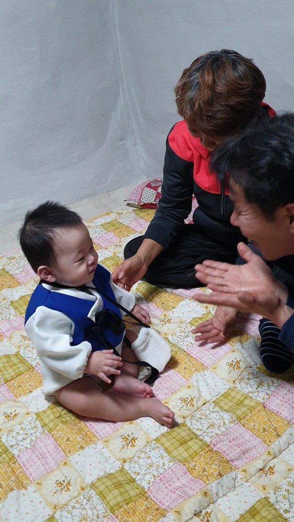 [사연] : 우리아기 태어나서 처음 맞이하는 명절 설날. 예쁜 꼬까한복입고 할머니할아버지께 세배하러 간 날 . 입가에 함박미소가 가득 ~행복이 넘쳤던 명절이였네요.