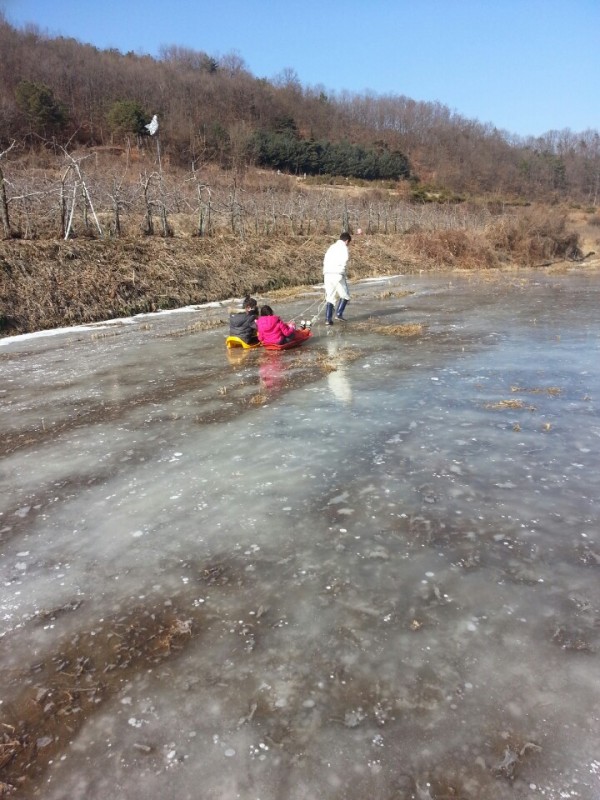 올해는 특별히 할아버지께서 추수가 끝난 논에 물을 남겨 얼음판을 만들어주셨다.