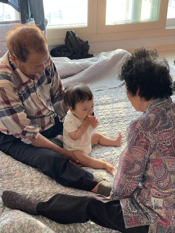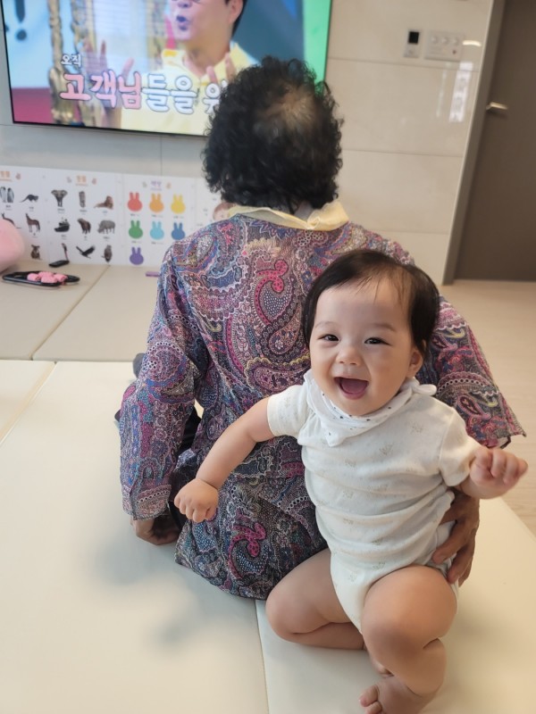 [사연] : 할아버지 팔순 잔치로 모인 날, 할아버지 할아버지 할머니 곁에서 재롱을 부리는 모습입니다. 처음 어른들을 만났을 때는 낯을 가리며 울어서 난처하게 하더니 이젠 먼저 알은체 하고 다가가서 간식을 달라고 하기도 하고 업히려고도 하네요. 아이를 낳기 전엔 본 적 없었던 어른들의 행복한 미소를 보며 벅찬 기분이 듭니다.
