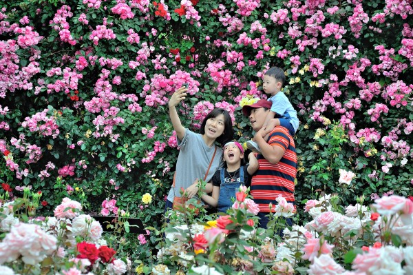 [사연] :장미가 만발한 공원 나들이 가족이 사진을 찍으며 즐거운 시간을 보내고 있어요.