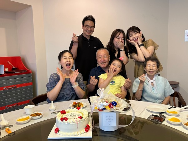 두번째 사진은 그런 쪼그만했던 돌쟁이 손녀 축복이가 어느덧 6살이되고, 할아버지도 힘든 투병 속에서도 환갑을 맞이하시게 되어 찍은 환갑 파티 사진입니다. 사진에서도 느껴지다시피 모두가 활짝 하하호호 즐겁게 웃는 모습을 보면 저절로 미소가 지어집니다. 손녀 축복이의 증조 외할머니까지 4대가 모여 함께한 시아버님의 환갑은, 너무나 뜻깊고 행복했습니다.