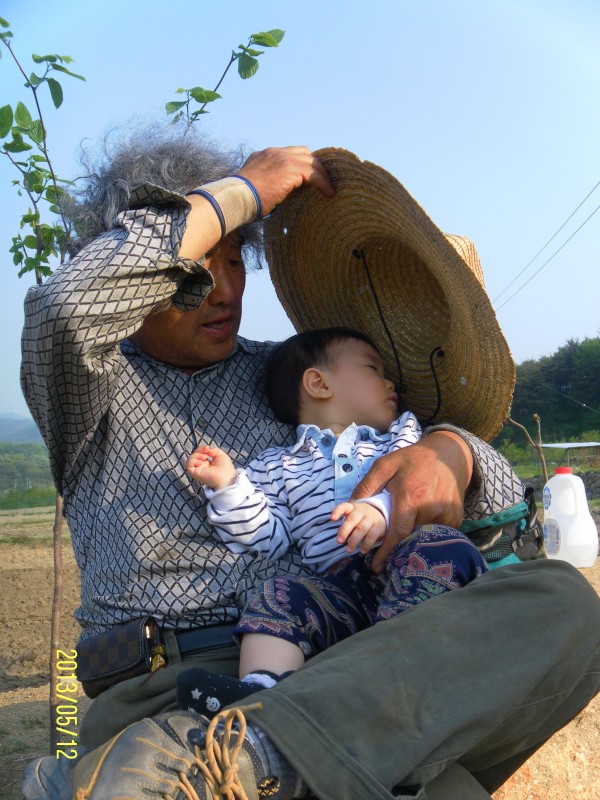 아버님께서 이렇게 힘들게 농사일을 하시다가 점심 도시락을 드시거나 잠시 쉬시는 "배꼽마당"이라는 공간이 있어요. 할아버지 배꼽마당에서 할아버지와 한참 놀다가 할아버지 품에 안겨 잠이 든 손자 얼굴이 탈까 눈이 부실까 아버님께서는 쓰고 계시던 밀짚모자를 벗어 손자의 얼굴을 가려주시고 계시네요. 이 사진을 볼 때마다 표현은 잘 하시지 않지만 마음 속 깊은 아버님의 따뜻한 내리사랑이 느껴져 부모로서도 며느리로서도 부족한 저는 아버님에 대한 고맙고 죄송스러운 마음에 고개가 숙여집니다. 그 사랑 잘 이어가겠습니다. 아버님, 항상 건강하세요. 살면서 부족함 잘 채워나가며 효도하겠습니다.