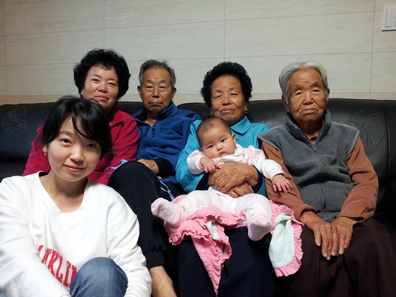 100세 가까운 연세에도 정정하신 외고조할머니, 외증조할아버지, 외증조할머니, 외할머니, 지윤이엄마, 지윤이까지... 5대가 모여 기념으로 찍은 사진입니다.