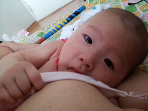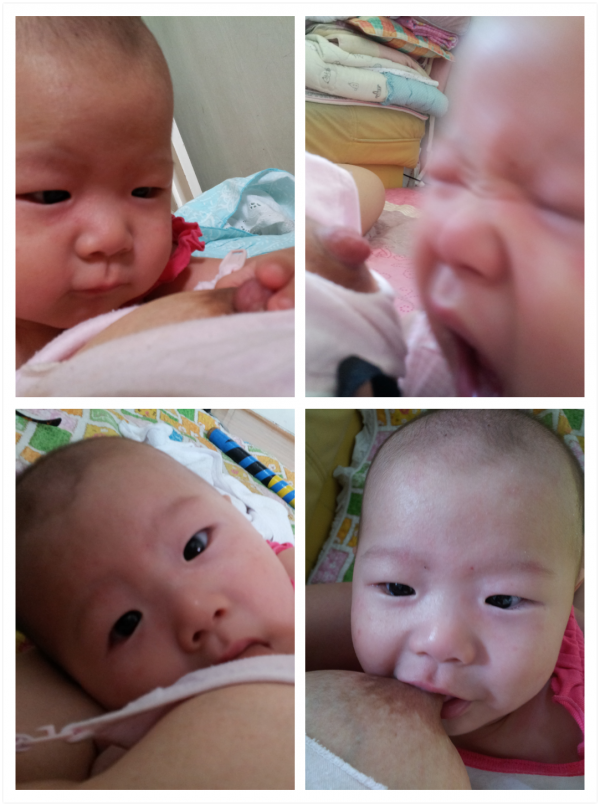 둘째사진: 젖을 보면 멀리서 막 기어와 눈을 찡그리며 입을 쩌억 벌린다.