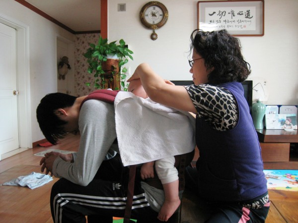 태어날 때부터 머리색이 옅고 숱이 없던 부석이. 벼르고 벼르다가 돌이 지나자마자 외할머니께서 머리를 밀어주셨어요. 침침한 눈에도 불구하고 행여나 손주의 보드라운 머리에 상처라도 생길까 돋보기까지 껴가며 면도날을 잡으신 할머니와 자기머리가 깎여지는지도 모른 채 피곤한 아빠의 등에 업혀서 곤히 자고 있는 손자의 모습이랍니다.