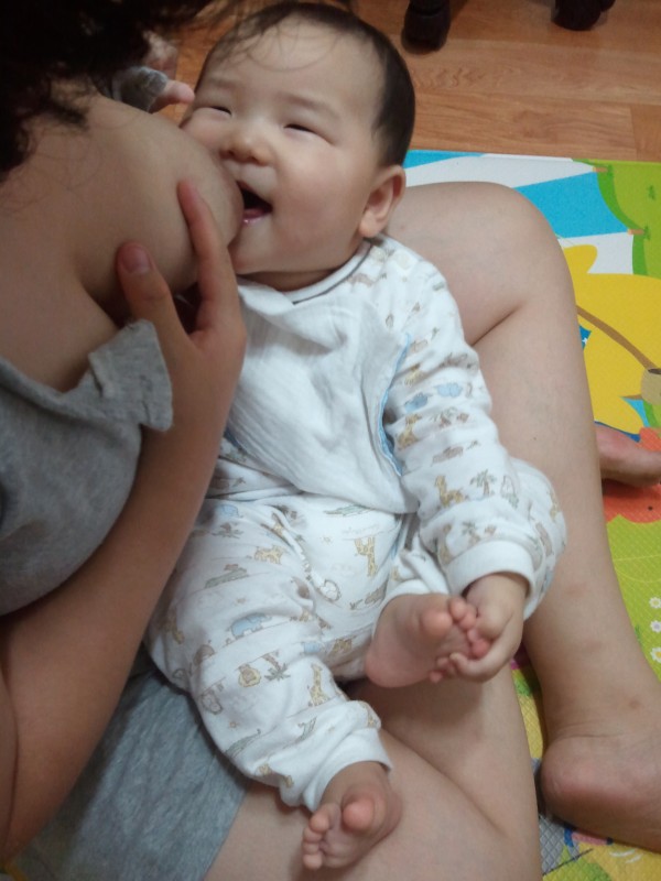엄마 젖을 먹을 때면 제 품에 안겨서 행복해하는 아들의 모습을 보니 저는 좀 더 먹이고 싶습니다.
