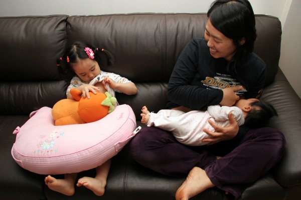 그런데 둘째아이가 엄마젖을 먹을때마다 언니인 첫째아이가 수유쿠션을 뺏어가는 바람에 편안하고 느긋하게 냠냠하지 못하고 있죠. 따라쟁이 언니는 자기도 엄마처럼 뿡뿡이에게 맛있는 젖을 주고싶은 거겠죠. 가끔은 동생보다 뿡뿡이를 더 끔찍히 생각하는 첫째가 서서히 동생에게 관심과 사랑을 보여 많이 흐뭇하고 가슴이 따뜻해져옵니다.