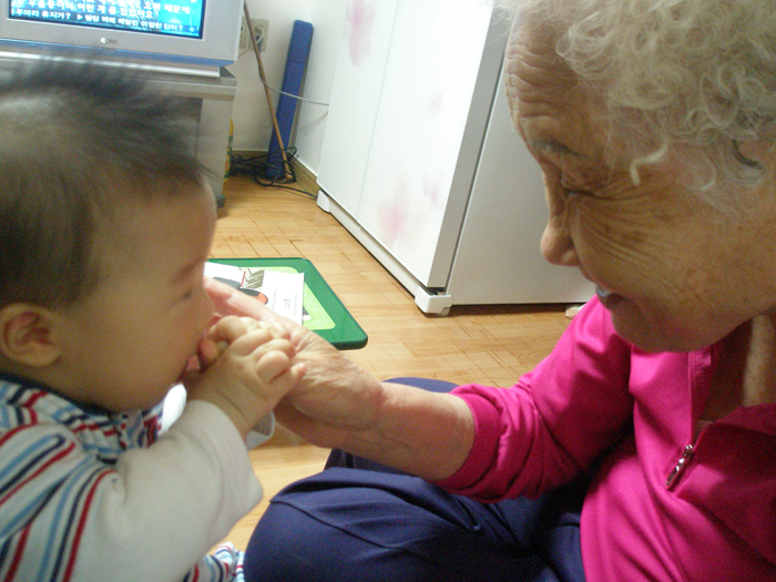 얼굴만 봐도 울던 환희가 할머니의 쭈글한 손을 마져보고는 입으로 가져갑니다