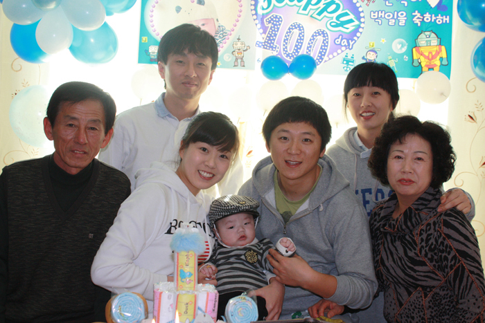 할아버지, 할머니, 고모, 고모부, 외할아버지, 외할머니, 이모, 외삼촌이 함께 모여 조촐한 100일 파티를 했어요^^