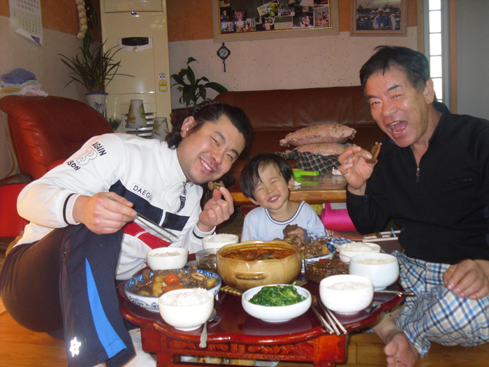 김씨 3부자들이 음식을 다 차리기도 전에 갈비를 하나씩 잡고 얼마나 맛있게 먹는지