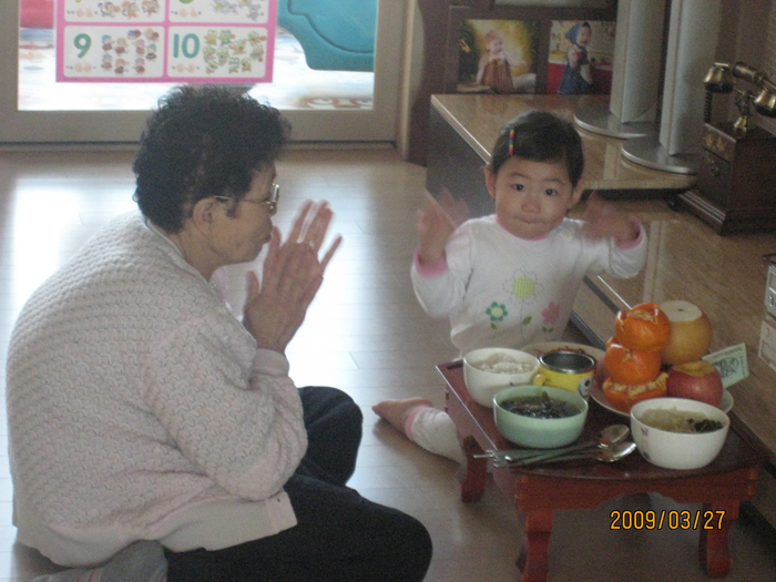 증조할머니는 정성껏 빌고 계시는데 아무것도 모르는 딸아이는 장난만 계속 치고 있습니다..