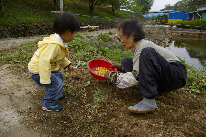 - 파일 1 (IGP6964.JPG): 땅을 일구고 옥수수 알갱이를 고르고 계시는 상할머님과 아직 말을 못하는 손자는 옹알옹알 이며 손가락도 가르치켜 상할머님과 대화를 합니다.