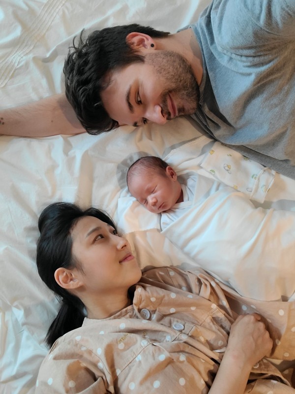 태오가 잠든사이 첫 가족 사진을 찍었어요.