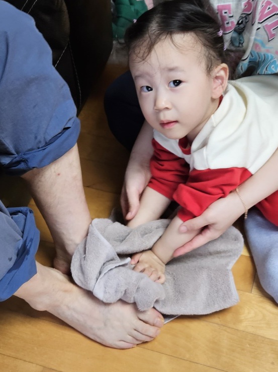 어버이 은혜에 감사한 마음을 담아 할아버지 발을 닦아드린 손녀의 모습입니다.