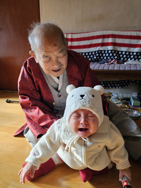 [사연] : 저는 엄마 아빠가 결혼한 지 9년만에 태어난 귀한 딸 변하윤 아기입니다. 24년 5월 24일에 첫돌은 맞이하기도 했고요. 저의 첫 명절이었던 지난 설에 증조 할아버지댁을 방문했어요. 증조 할아버지는 연신 미소를 지으셨지만 '할아버지, 저 좀 놔주세요. 엄마한테 갈래요 으앙~' 증조 할아버지와는 95세 차이가 나요. 늘 건강하세요♡