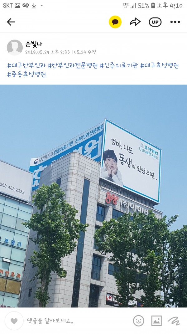 [행복 사연] :1년전효성병원에서너무도감사하게건강한아이를출산하게된아들엄마입니다이제돌된아기와고군분투육아중에도아이가너무예뻐서하루하루행복해하며지내고있습니다 첫아이를만난지1년정도되니이제둘째를고민해야하더라구요 신랑이하나만낳아잘기르자고하여둘째는없다라고생각하고있었는데 저는혼자라외로울까봐마음으로걱정을많이하고있었습니다그러던중 동생이생기길바란다는 효성병원광고를보니마음이덜컹하더라구요 우리아이도동생을원할수도있겠다는생각이들면서요