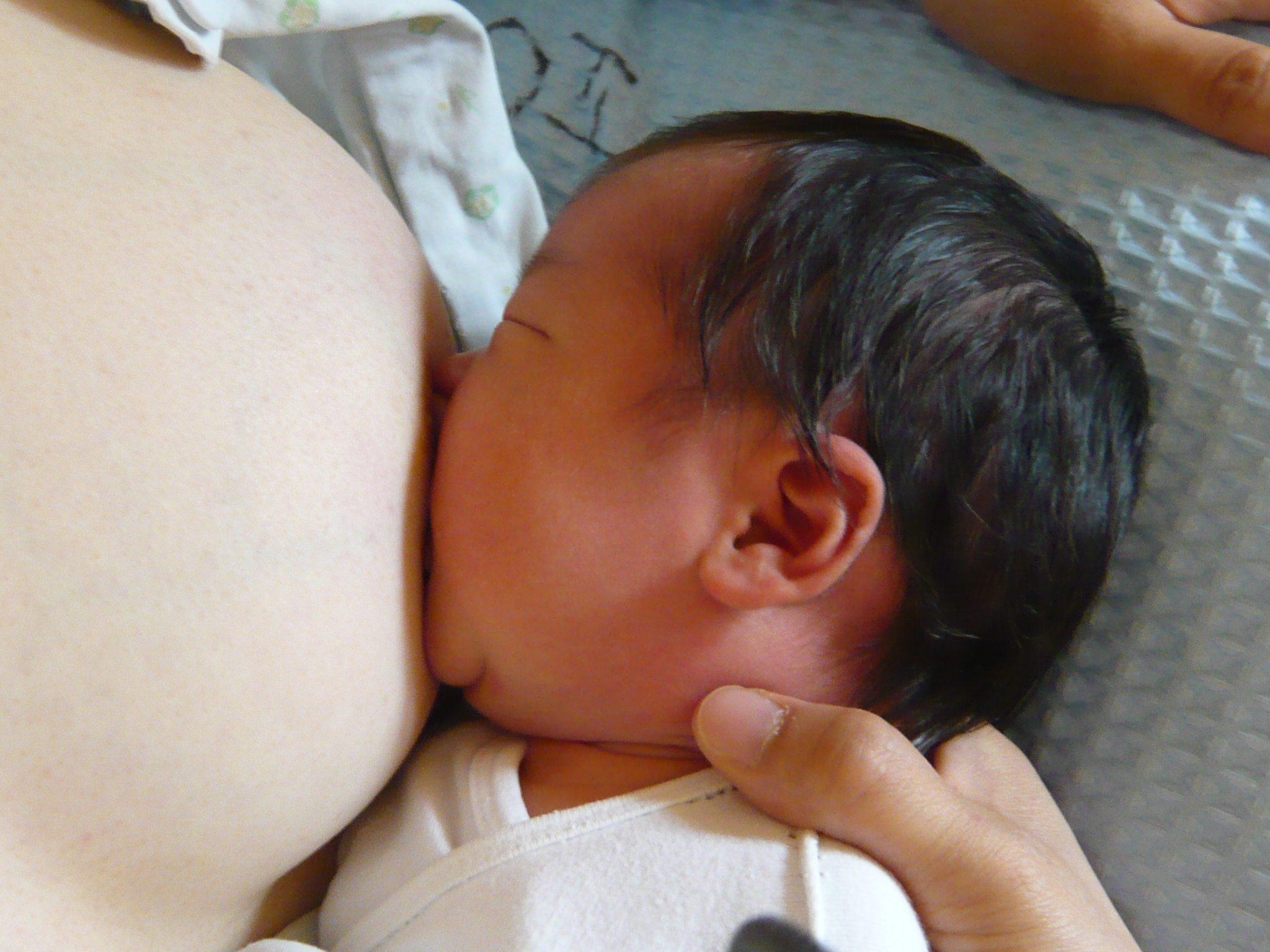모유를 먹이려고 나에게 기댄 순간에 입을 오므리다 갑자기 크게 벌리고 젖을 물었습니다.
