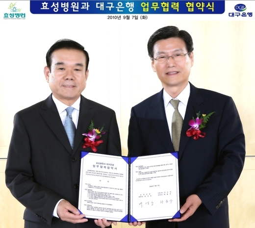 | ▲ 효성병원 박경동 원장(왼쪽)과 하춘수 대구은행장이 고객감동경영 강화를 위한 상호협력 협약을 체결한 뒤 포즈를 취하고 있다. |